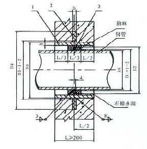 5、Ⅱ型套管穿墻處之墻壁,如遇非混凝土墻壁時(shí)應(yīng)改用混凝土墻壁,其澆注混凝土范圍,Ⅱ型套管應(yīng)比翼環(huán)直徑(D4)大200mm,而且必須將套管一次澆固于墻內(nèi)。套管內(nèi)的填料應(yīng)緊密搗實(shí)。